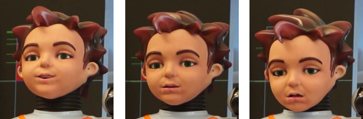 Hanson Robotics."Alice" and "Zeno" each had a human-like body and additional motors under synthetic skin that allowed for adjusting their facial expressions. The application that controlled their behavior continuously matched their expressions and head pose to the emotional state detected by the SSI pipeline.